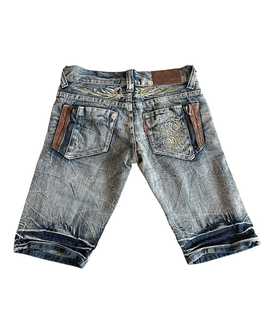 Tornado Mart Leather Detail Embroidery Denim Jean Shorts