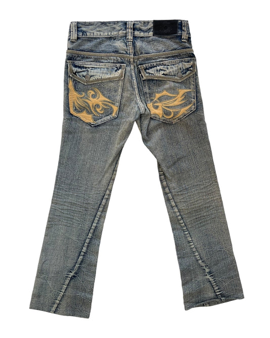 2000s Tornado Mart Tribal Embroidery Twisted Seam Chain Stitch Denim