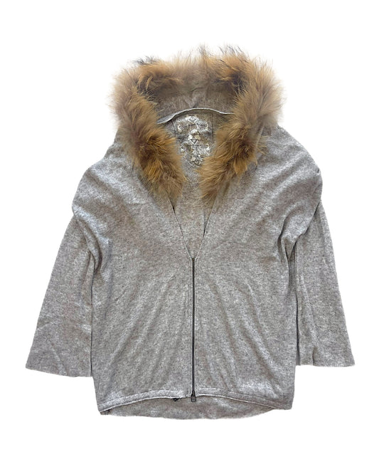 GOA Raccoon Fur Hood Knit Zip Shawl + Layer Knit Raw Hem Sweater