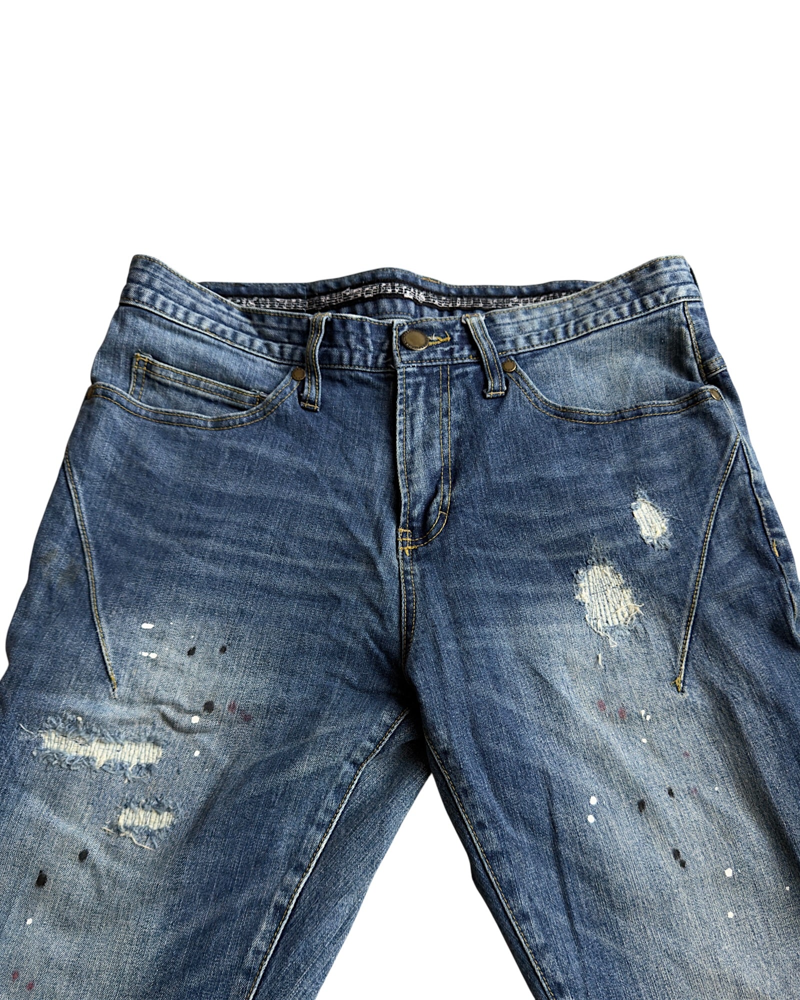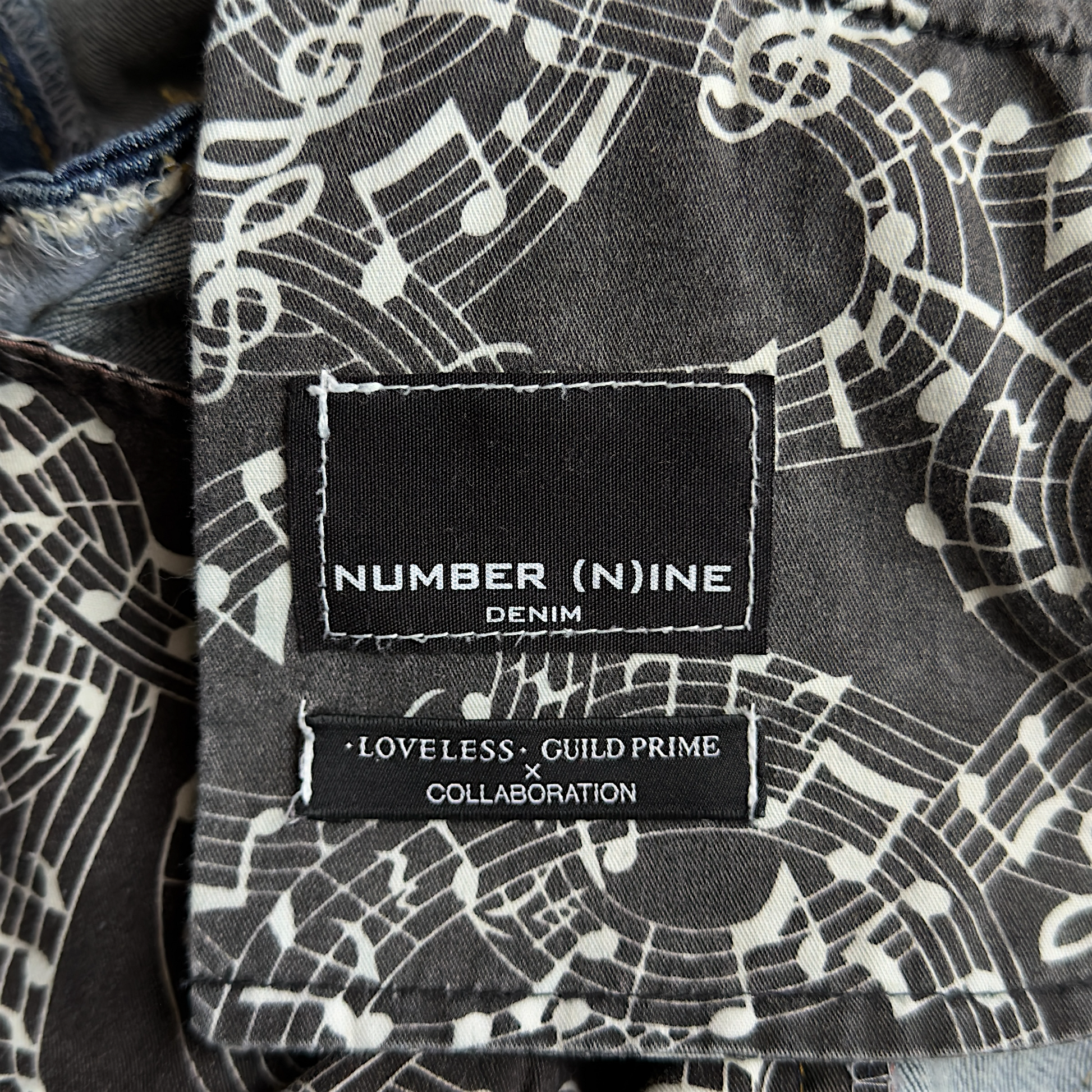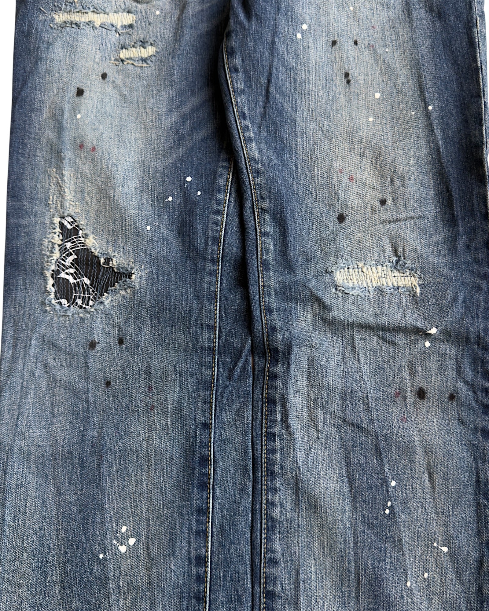 Number (N)ine x Loveless Music Notes Paint Splatter Distressed Repaired Denim Jeans